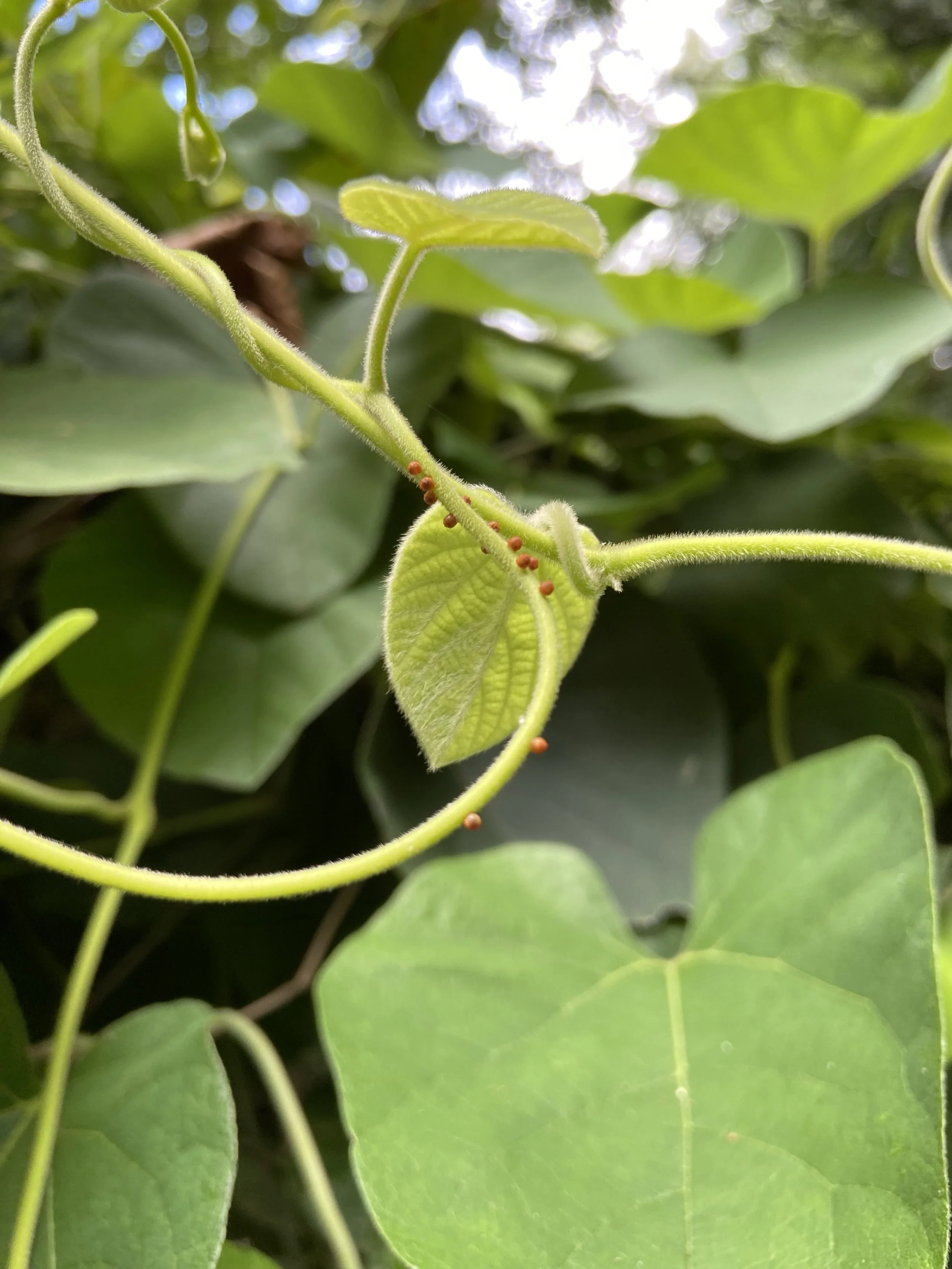 But the pipevine swallowtail’s ONLY host plant around here is Dutchman’s pipevine. That makes it much easier to find their caterpillars. Add to that, both their eggs and young caterpillars are orangey-red and clustered together. Add to that, the moms generally prefer laying their eggs on the vine tendrils rather than the leaves, and the leaves are just now coming out, which makes those eggs easier to spot on the vine.