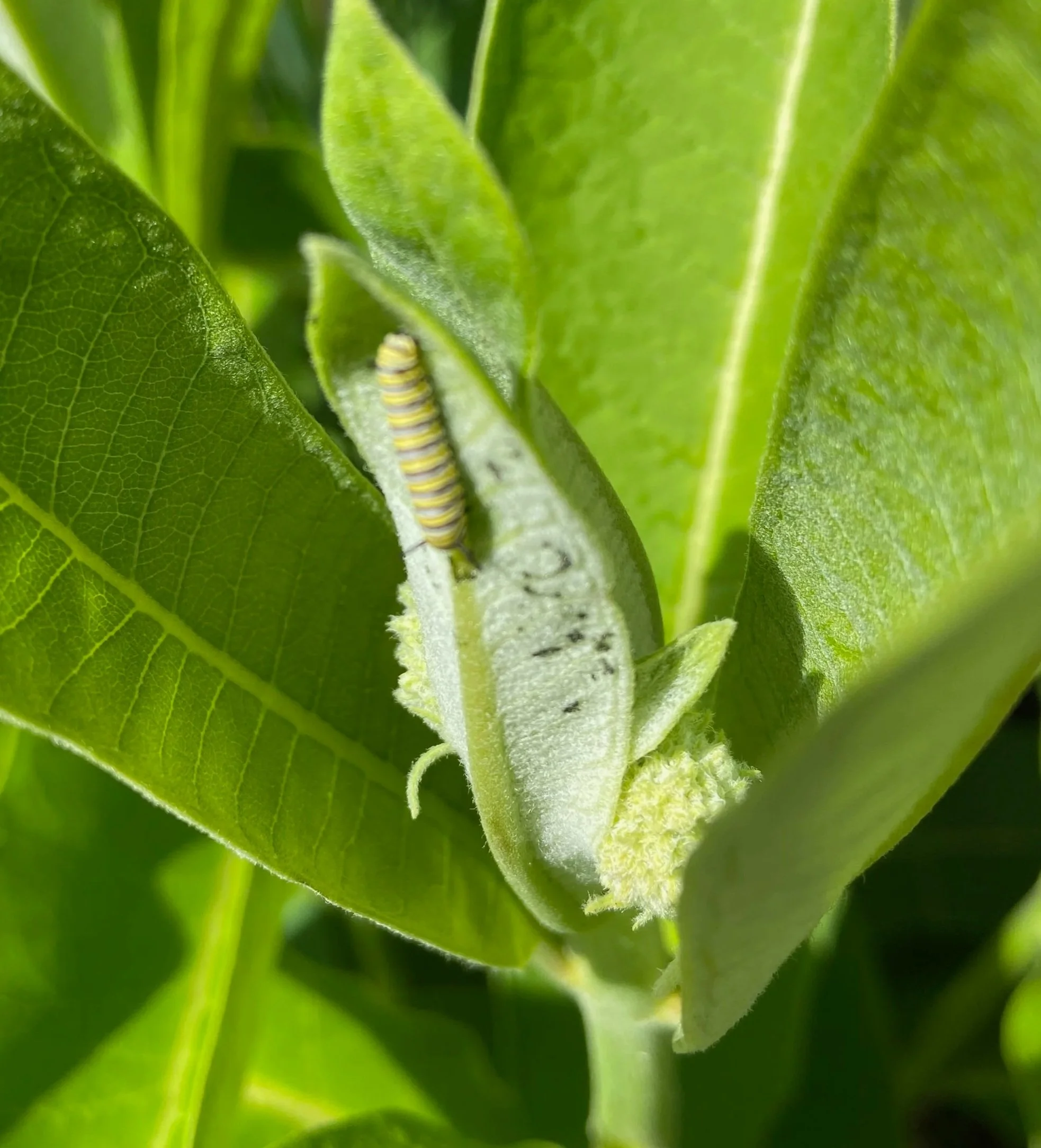 Those eggs hatch into black/white/yellow striped caterpillars. Young caterpillars often notch the leaf’s midrib to drain the latex that would otherwise glue their mouths shut. If the midrib has been notched, inspect the milkweed carefully and you will probably find a monarch caterpillar there.